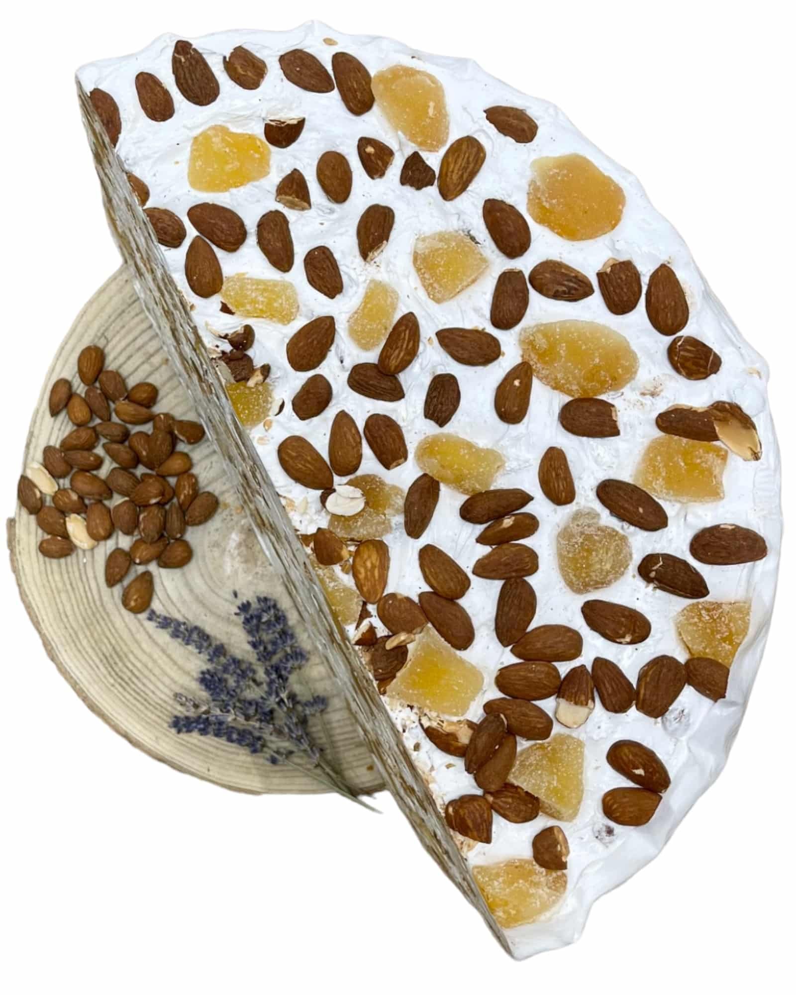 Ingrédients : Blanc d’œufs, miel de lavande, amandes, gingembre confit, sucre. Peut contenir des traces d’autres fruits à coque.